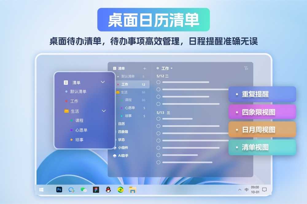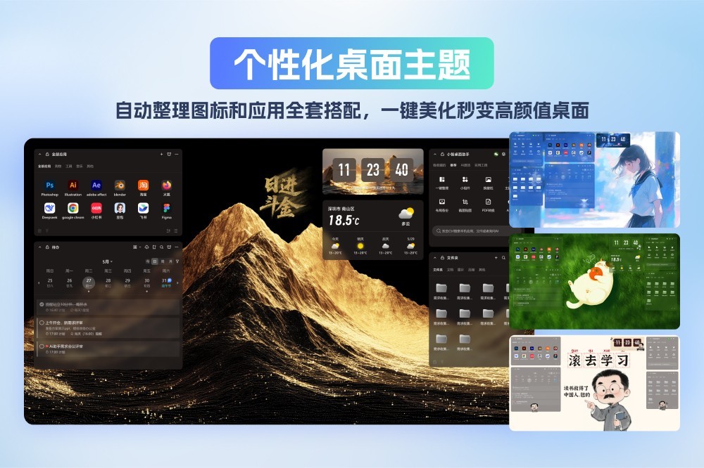 小智桌面,一站式AI桌面整理与美化,待办日程提醒。 - AI能力:支持OpcClaw(龙虾)、Nano Banana、Deepseek、千问等热门AI模型,百余种智能体,包括:代码编程、文案创作、论文润色,营销文案等,满足各种场景使用需求。 - 高效图标整理:一键/实时整理,自定义名称或后缀分类整理。 - 快捷启动提效:快速搜索本机文件、应用、系统设置;快速添加和启动应用、文件、网页。 - 贴心任务时间管理:待办多样清单与日历视图、重复提醒、自定义筛选与导出,桌面日历便签。 - 多端高效同步:桌面布局本地备份与同步、壁纸同步、待办同步。 - 沉浸式美化体验:精美动静态壁纸、个性化桌面分区外观、系统美化。 - 丰富功能:待办分区与小组件,包括天气、星座、日期、日历、时钟等热门组件工具。
